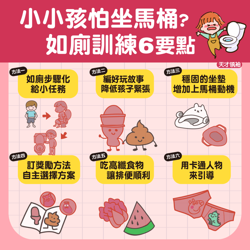 萬一孩子已經會排斥坐馬桶,爸媽首先一定要調整自己的心態,孩子就是某個原因卡住了,大人越催促、越兇,只會讓孩子對坐馬桶這件事更貼上負面的標籤,一點幫助也沒有。唯有大人調整心態,放鬆情緒,才會有更多創意和幽默感,化解孩子的恐懼。讓害怕坐馬桶的孩子願意坐馬桶,有6個訣竅: